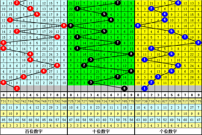 3、在以上0-9号码频次中,号码大小比为27:40,012路比为29:22:16,本期展望百位开出2路号码,参考号码2。